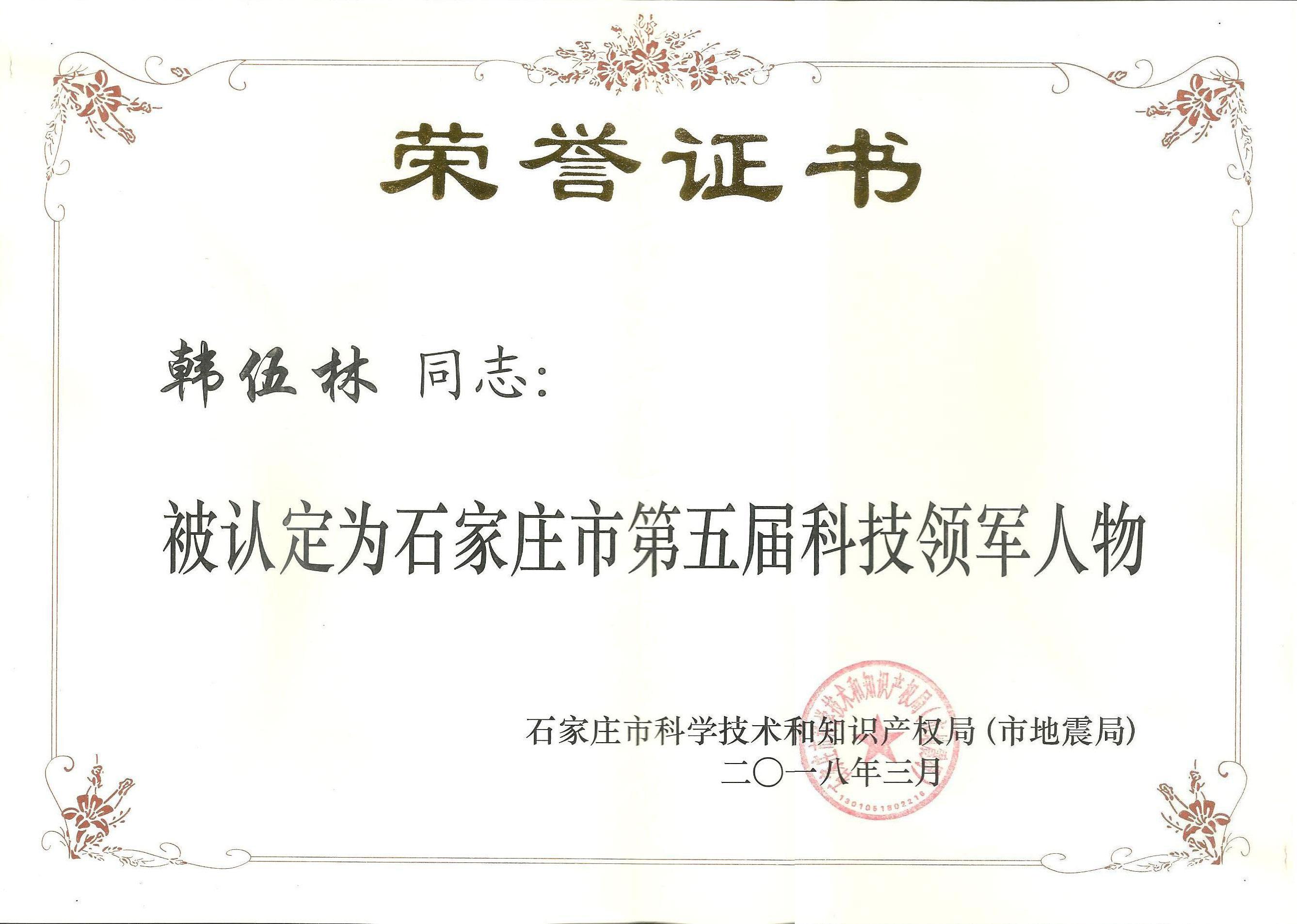 韓伍林董事長(zhǎng)認(rèn)定為第五屆科技領(lǐng)軍人物