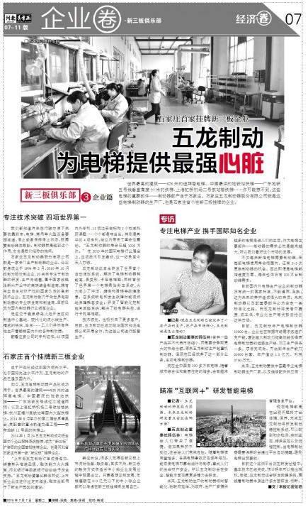 2015年7月7日,我公司榮幸在《河北青年報》07版刊登了作為石家莊市首家新三板掛牌企業(yè)的專題報道。前期該報社的記者親臨五龍專門邀訪董事長,就去年新三板掛牌以來,企業(yè)的發(fā)展現(xiàn)狀與未來展望進行交流。