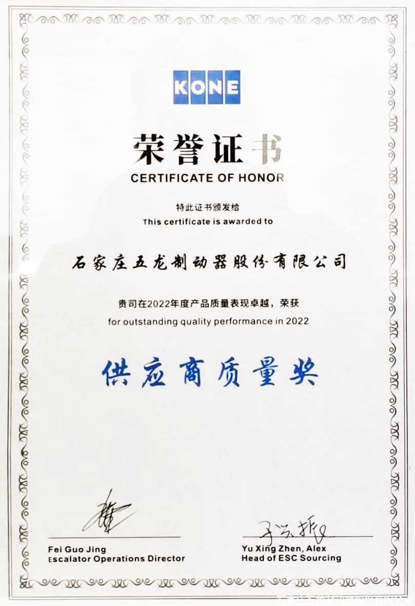 得知獲此殊榮,五龍制動非常感謝通力電梯的認(rèn)可,客戶給予我們的認(rèn)可就是對五龍制動最大的鼓勵!五龍制動始終以客戶為中心的企業(yè)文化理念,想客戶所想,急客戶所急,今后繼續(xù)為優(yōu)質(zhì)客戶提供五龍更好的服務(wù)與品質(zhì)。