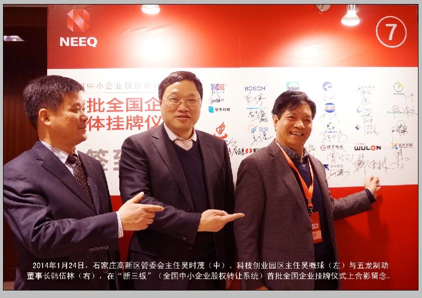 在市政府與高新區(qū)工委、管委領(lǐng)導(dǎo)的幫助支持下,五龍公司自2010年開始籌備“新三板”掛牌工作,2010年10月完成股改,經(jīng)過三年不懈努力,五龍制動(dòng)成功掛牌。2014年1月24日掛牌儀式標(biāo)志著五龍制動(dòng)公司正式在全國首批中小企業(yè)股轉(zhuǎn)系統(tǒng)掛牌,股票簡稱:五龍制動(dòng),股票代碼:430540。五龍制動(dòng)公司成為新三板擴(kuò)容后的全國首批二百余家掛牌企業(yè)之一,也成為河北省三家掛牌企業(yè)之一,也是石家莊市首家“新三板”掛牌企業(yè)。這意味著五龍公司迎來了一個(gè)新的歷史發(fā)展機(jī)遇,五龍公司在公司發(fā)展史上樹立了一個(gè)新的里程碑。